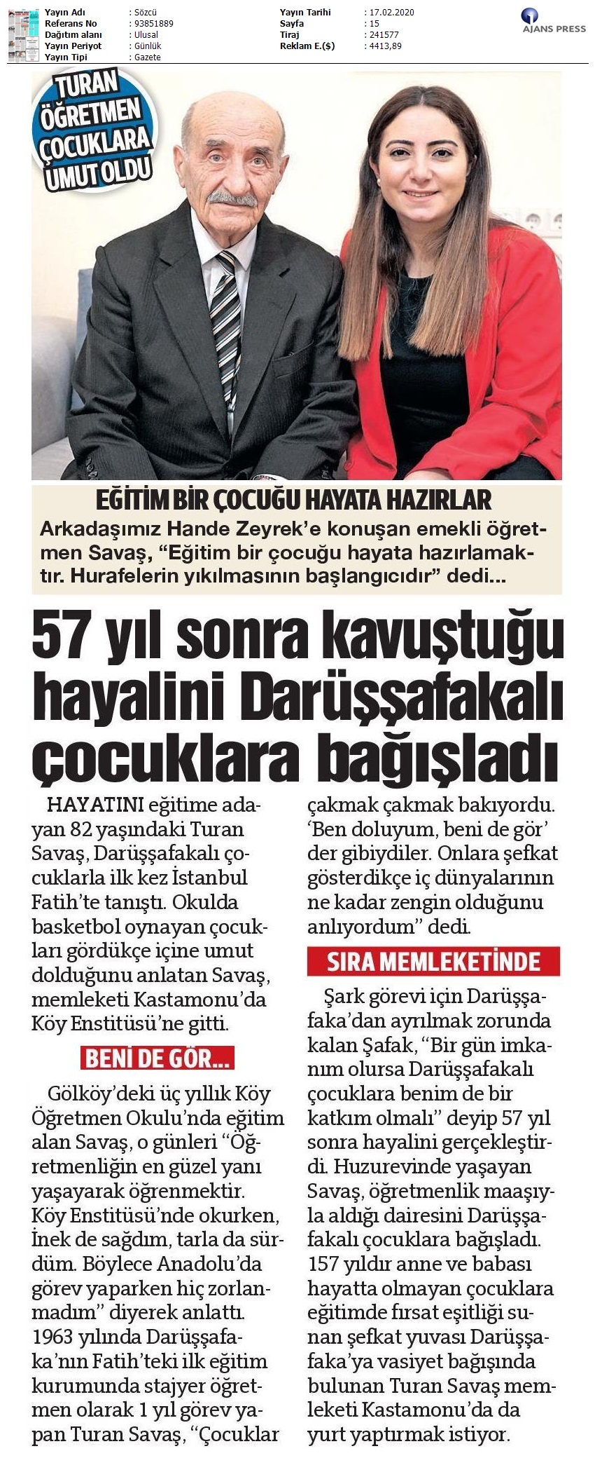 Basında Yaşlılık57 Yıl Sonra Kavuştuğu Hayalini Darüşşafaka’lı Çocuklara Bağışladı Şubat 12, 2021 tarafından gönderildi alıntıdır 24 Şub 57 Yıl Sonra Kavuştuğu Hayalini Darüşşafaka'lı Çocuklara Bağışladı Not: Bu Yazı Sözcü Gazetesinde 17.02.2020 tarihinde 15. sayfasında yayınlanmaktadır.