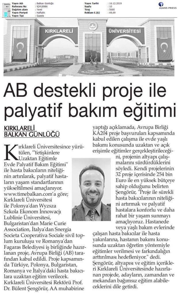 Basında Yaşlılık“AB destekli proje ile palyatif bakım eğitimi” Şubat 12, 2021 tarafından gönderildi alıntıdır 17 Ara ``AB destekli proje ile palyatif bakım eğitimi`` Not: Bu Yazı Balkan Günlüğü Gazetesinde 16.12.2019 tarihinde 10. sayfasında yayınlanmaktadır.