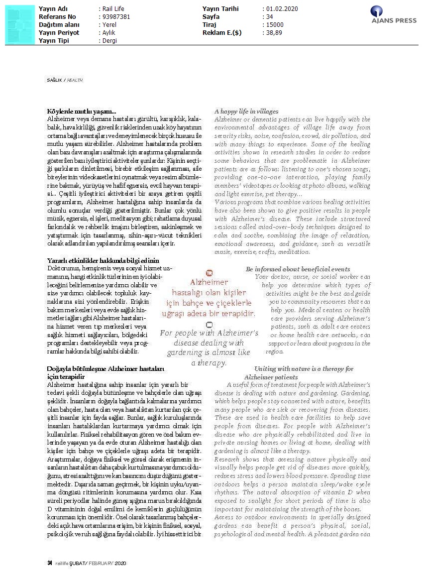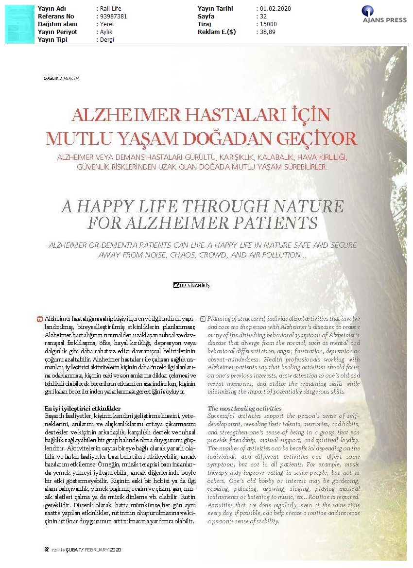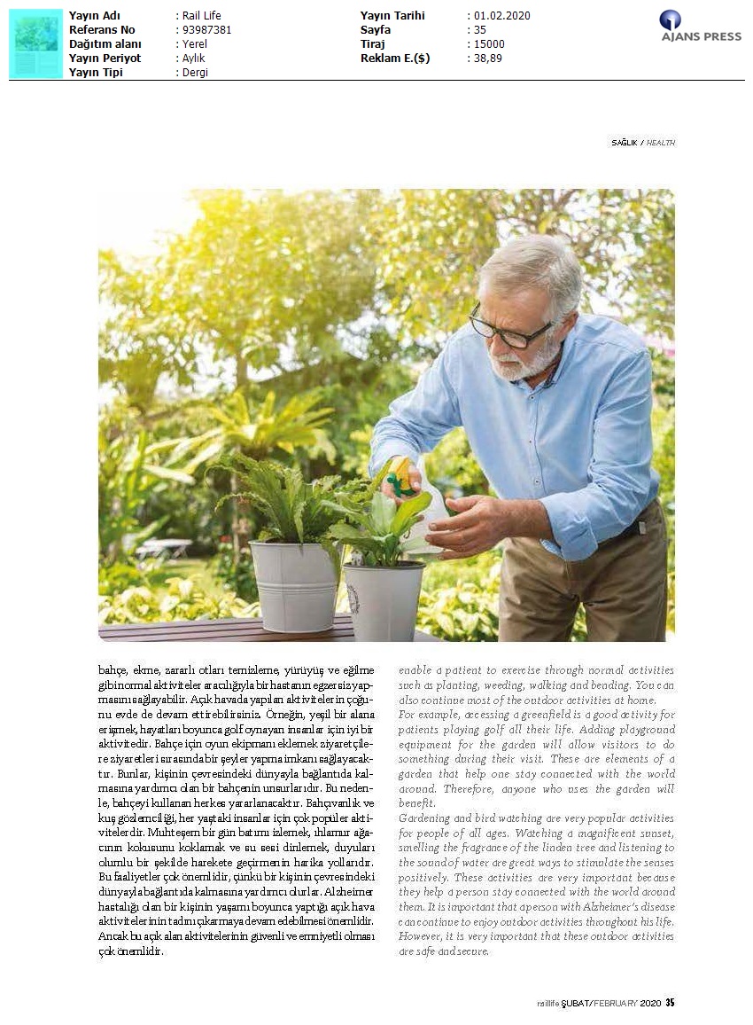 Alzheimer Hastalığı, Basında YaşlılıkAlzheimer Hastaları için Mutlu Yaşam Doğadan Geçiyor Şubat 12, 2021 tarafından gönderildi alıntıdır 24 Şub Alzheimer Hastaları için Mutlu Yaşam Doğadan Geçiyor Not: Bu Yazı Rail Life Dergisinde 01.02.2020 tarihinde 32-35. sayfalarında yayınlanmaktadır.