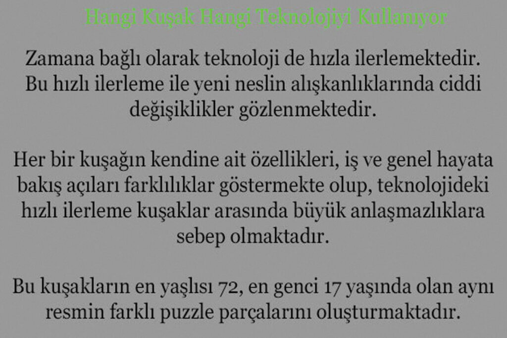 Zamana bağlı olarak teknoloji de hızla ilerlemektedir. Bu hızlı ilerleme ile yeni neslin alışkanlıklarında ciddi değişiklikler gözlenmektedir. Her bir kuşağın kendine ait özellikleri, iş ve genel hayata bakış açıları farklılıklar göstermekte olup, teknolojideki hızlı ilerleme kuşaklar arasında büyük anlaşmazlıklara sebep olmaktadır. Bu kuşakların en yaşlısı 72, en genci 17 yaşında...