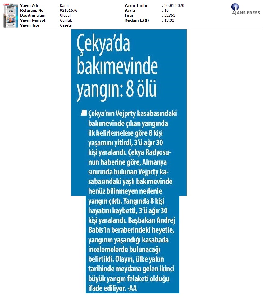 Basında YaşlılıkÇekya’da Bakımevinde Yangın 8 Ölü Şubat 12, 2021 tarafından gönderildi alıntıdır 20 Oca Çekya'da Bakımevinde Yangın 8 Ölü Not: Bu Yazı Karar Gazetesinde 20.01.2020 tarihinde 16. sayfasında yayınlanmaktadır.