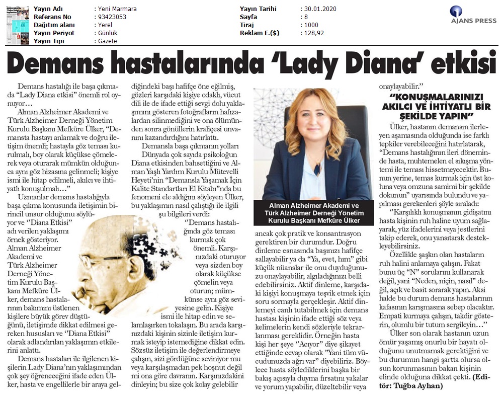 Basında YaşlılıkDemas Hastalarında Lady Diana Etkisi Şubat 12, 2021 tarafından gönderildi alıntıdır 30 Oca Demas Hastalarında Lady Diana Etkisi Not: Bu Yazı Yeni Marmara Gazetesinde 30.01.2020 tarihinde 8. sayfasında yayınlanmaktadır.