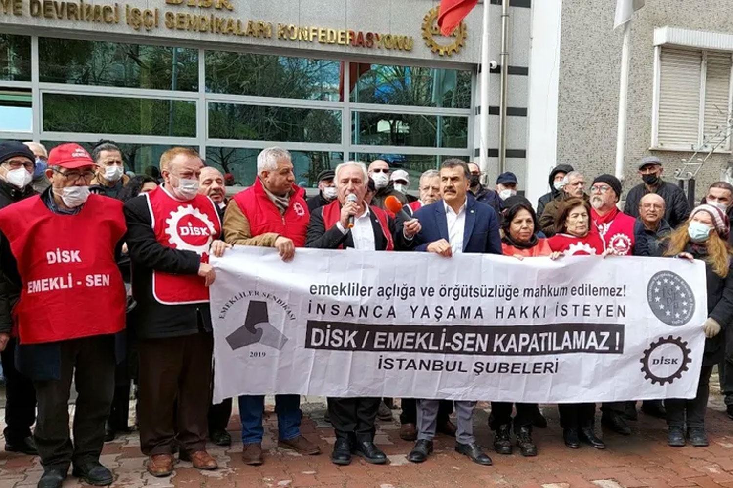 Devrimci İşçi Sendikaları Konfederasyonu’na bağlı (DİSK) Emekli-Sen üyeleri İstanbul’da, sendika hakkındaki kapatma kararını, düşük emekli maaşlarını ve yapılan son zamları protesto etti.