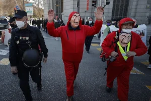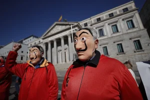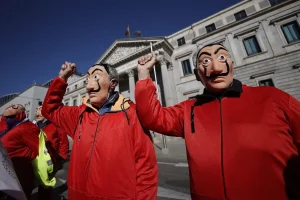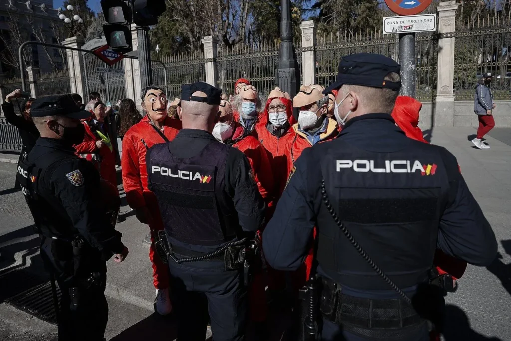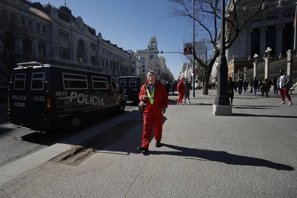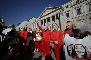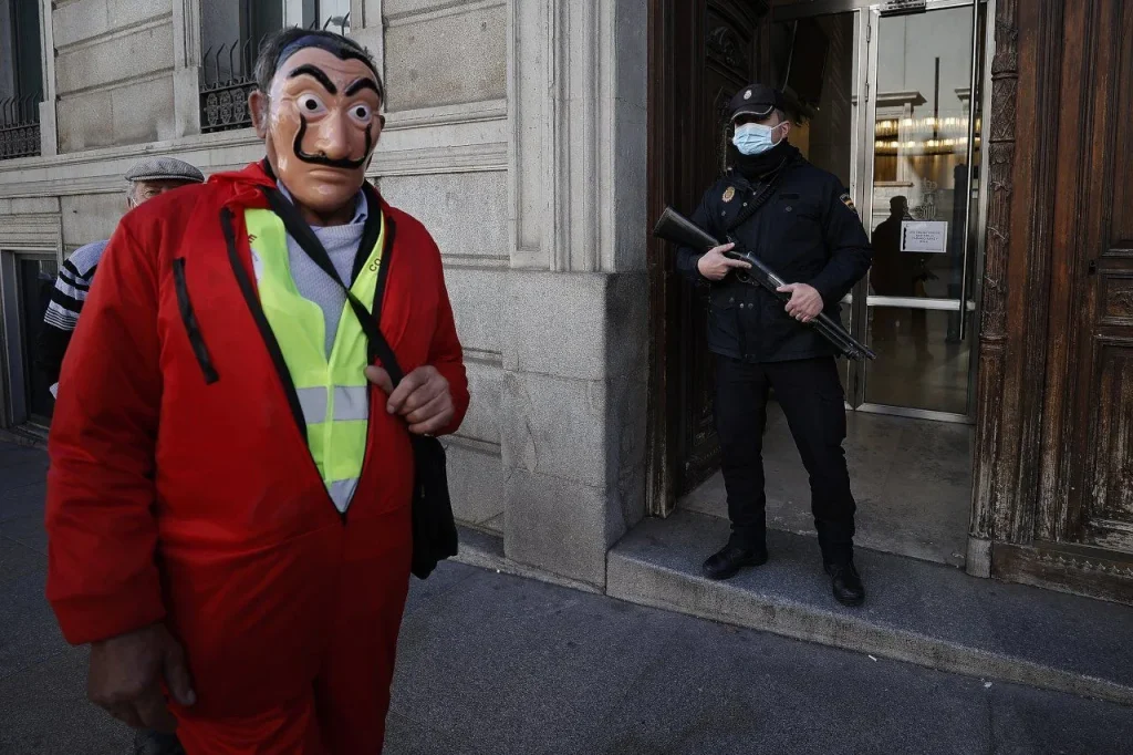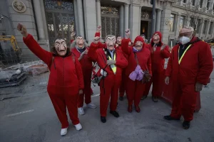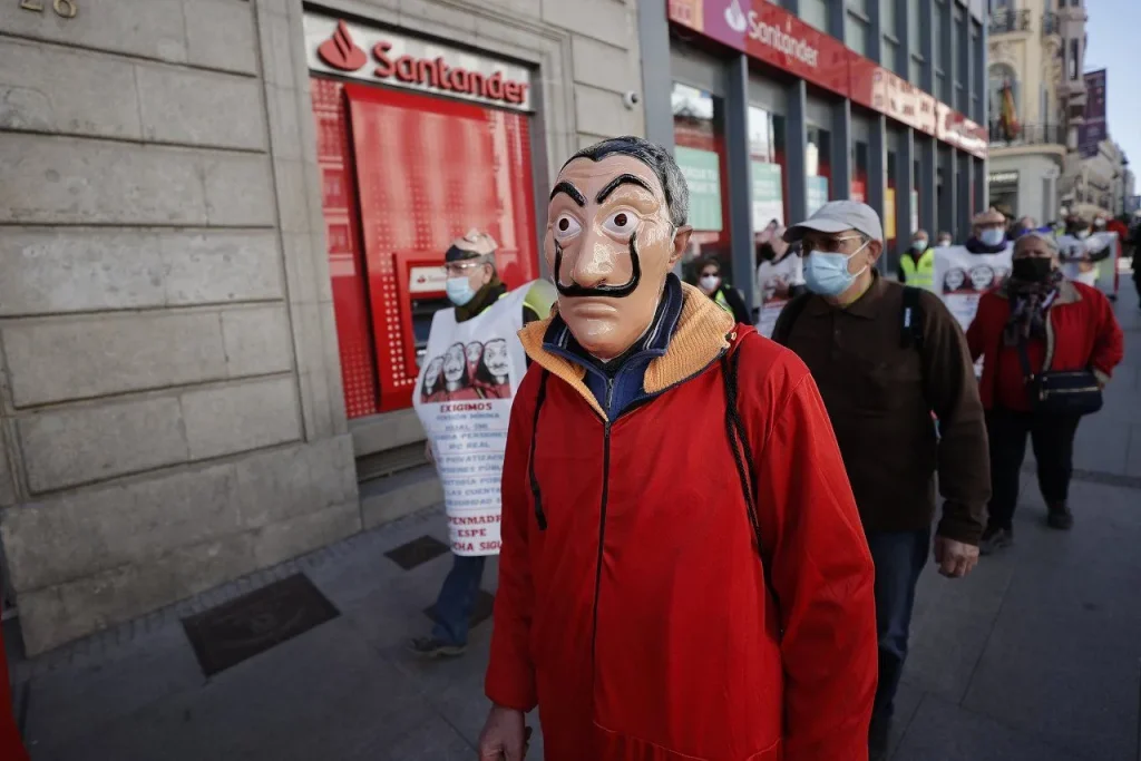 Emekliler ‘La Casa de Papel’ kostümleriyle İspanya Merkez Bankasına yürüdü
