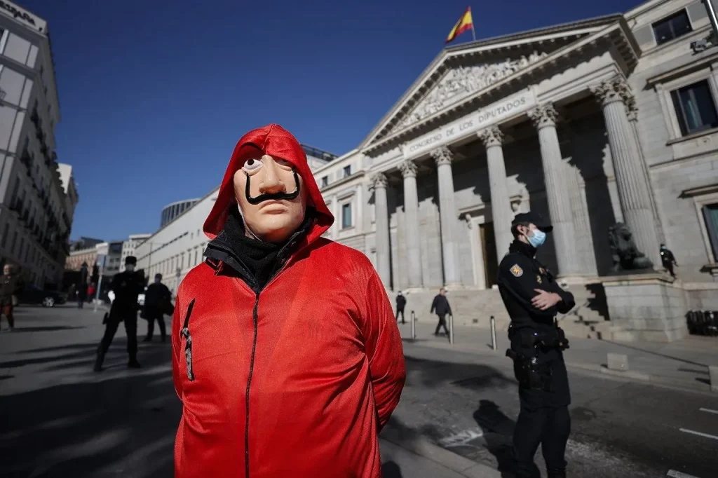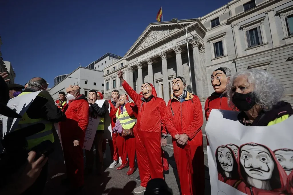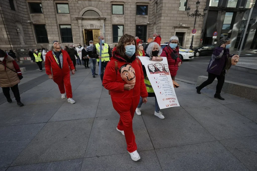 İspanya’da haklarının iyileştirilmesi talebiyle eylem yapan emekliler “La Casa de Papel” kostümleriyle İspanya Merkez Bankasına yürüdü.
