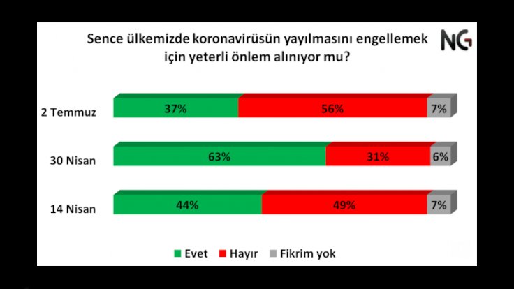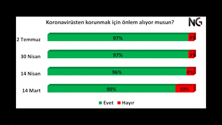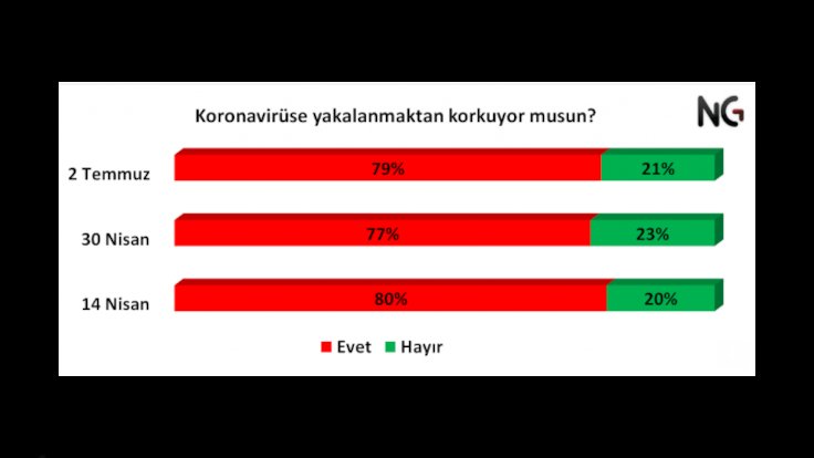 Araştırma korona virüsü salgını ile ilgili şimdiye kadar yaptığı dört araştırmanın sonuçlarını karşılaştırmalı olarak paylaştı. 29 Haziran-2 Temmuz arasında 81 ilden 15 yaş üzeri 2025 kişinin katılımı ile yapılan son araştırmaya göre vaka sayılarındaki artış insanların korona virüsüne yakalanmaktan korkma oranını etkilemedi. Son 3 araştırmada oranlar yaklaşık olarak aynı kaldı. Araştırma sonuçlarına göre her 5 kişiden 4’ü korona virüsüne yakalanmaktan korkuyor.