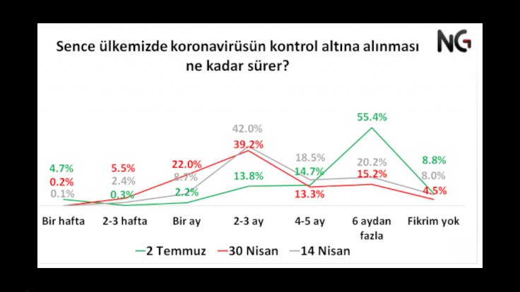 Ankete göre her 10 kişiden yaklaşık 9’u korona virüsünü ülkemiz için tehdit olarak görüyor. Korona virüsünün bir aydan kısa sürede kontrol altına alınacağını düşünenlerin oranı son 2 ay içinde yaklaşık olarak aynı kaldı. En belirgin fark salgının birkaç ay içinde kontrol altına alınacağını düşünenlerin, ağırlıklı olarak 6 aydan daha uzun bir süreye kayması oldu. Son durumda katılımcıların yarısından fazlası salgının kontrol altına alınabileceği sürenin 6 aydan daha uzun olduğunu düşünüyor.