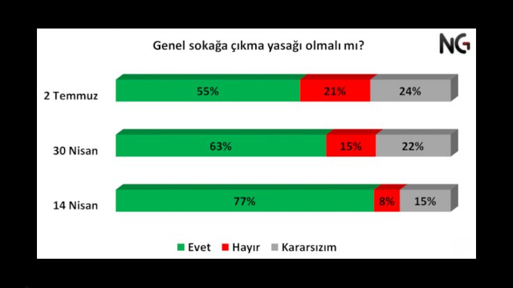 Haftasonu sokağa çıkma yasağına yaklaşımda çok büyük farklılıklar oldu. 30 Nisan’daki araştırmada yasağı destekleyenlerin oranı yüzde 83 iken, son araştırmada oran yüzde 43’e düştü. Kararsızların oranı ise 2 katından daha fazla arttı.