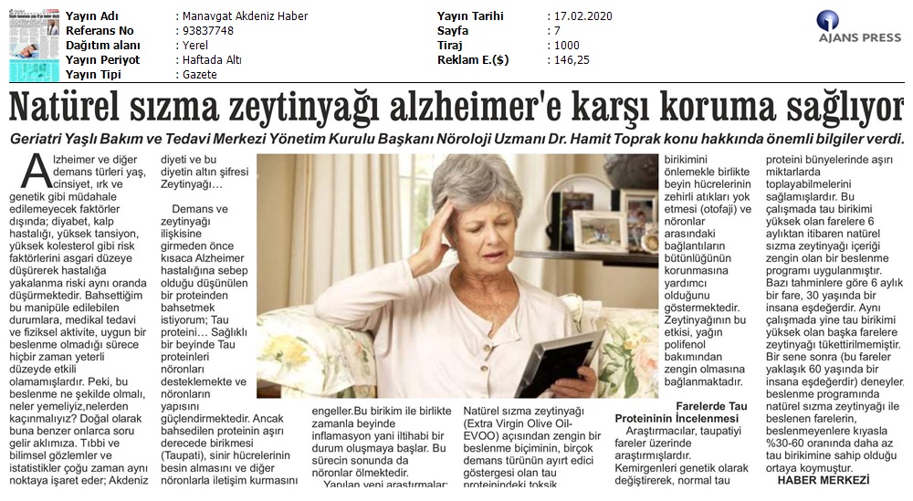 Alzheimer Hastalığı, Basında YaşlılıkNatürel Sızma Zeytinyağı Alzheimer’a Karşı Koruma Sağlıyor Şubat 12, 2021 tarafından gönderildi alıntıdır 24 Şub Natürel Sızma Zeytinyağı Alzheimer'a Karşı Koruma Sağlıyor Not: Bu Yazı Manavgat Akdeniz Haber Gazetesinde 17.02.2020 tarihinde 7. sayfasında yayınlanmaktadır.