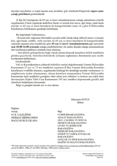 Valilerce; salgınının seyri anlık olarak takip edilerek hasta ve temaslı kişi, ağır hasta, entübe, vefat sayılarındaki  artış trendlerine göre 65 yaş ve üzeri vatandaşların gün içerisinde saat 10:00­-16:00 arasında sokağa çıkabilmelerine, bu saatler dışında sokağa çıkmamalarına dair kısıtlamaya gidilecek. Gelişmelere bağlı olarak alınan kararlar belirli aralıklarla gözden geçirilecek, kriterlerde iyileşme sağlanması durumunda kısıtlama aynı usulle kaldırılacak.