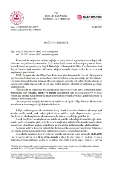 İçişleri Bakanlığı 81 İl Valiliğine ek genelge gönderdi. Bakanlık solunum yoluyla kolayca bulaşabilen Coronavirus salgınının önlenmesine yönelik olarak, özellikle yurttaşların yoğun olarak bulunduğu cadde ve sokaklarda “sigara içtiği” için maskeyi çene altına indiren ve yanlış kullananlar için harekete geçti.