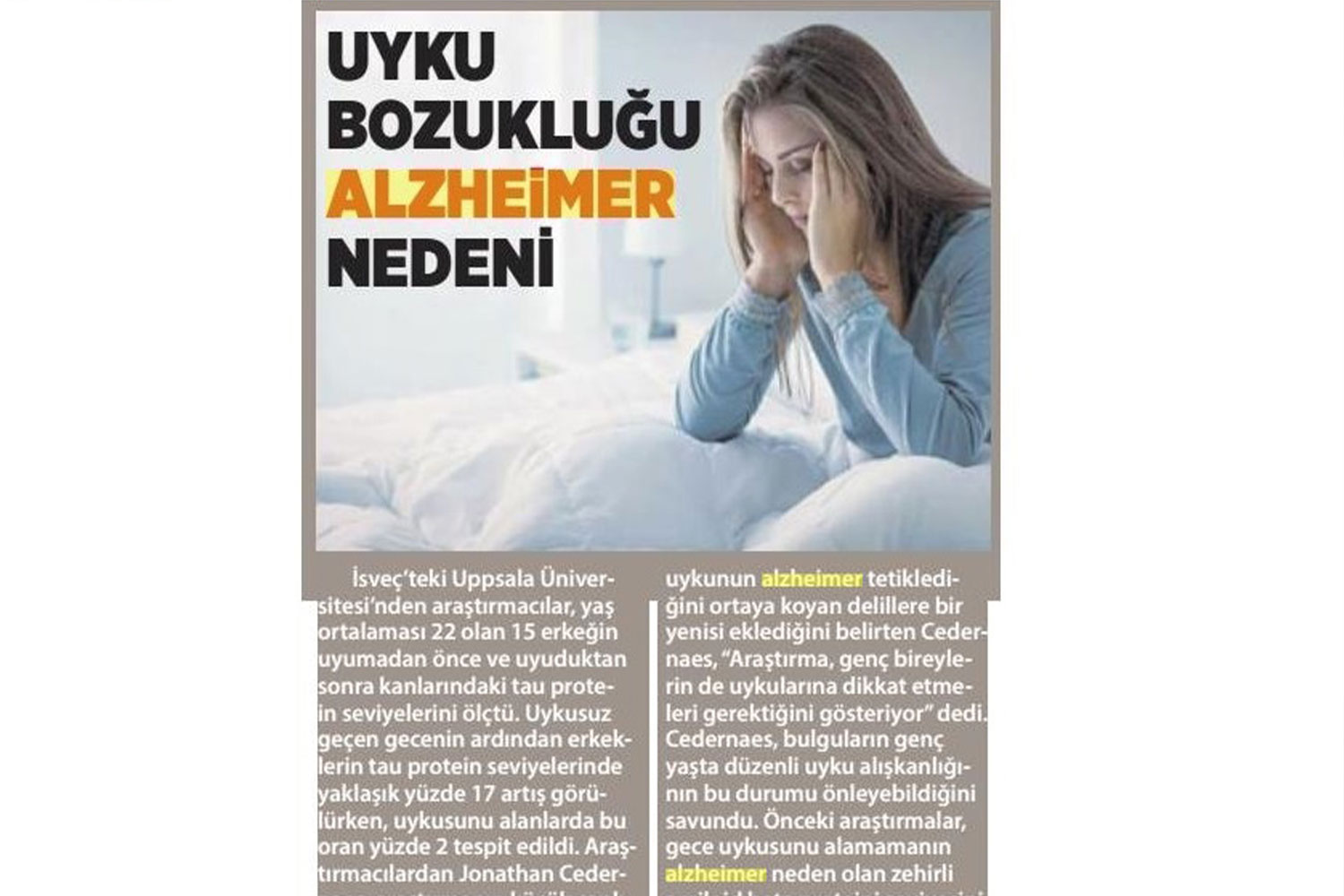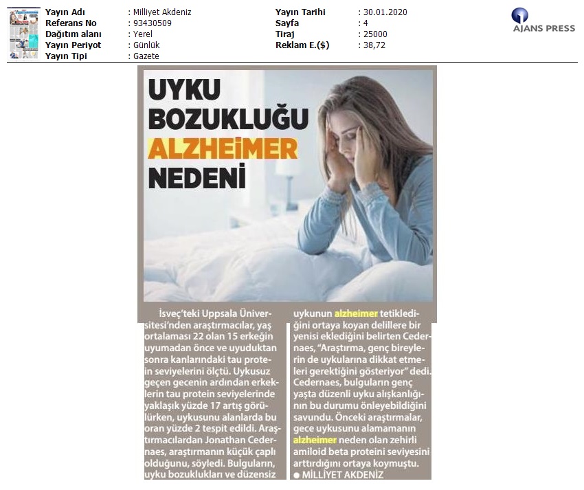 Basında YaşlılıkUyku Bozukluğu Alzheimer Nedeni Şubat 12, 2021 tarafından gönderildi alıntıdır 30 Oca Uyku Bozukluğu Alzheimer Nedeni Not: Bu Yazı Milliyet Akdeniz Gazetesinde 30.01.2020 tarihinde 4. sayfasında yayınlanmaktadır.
