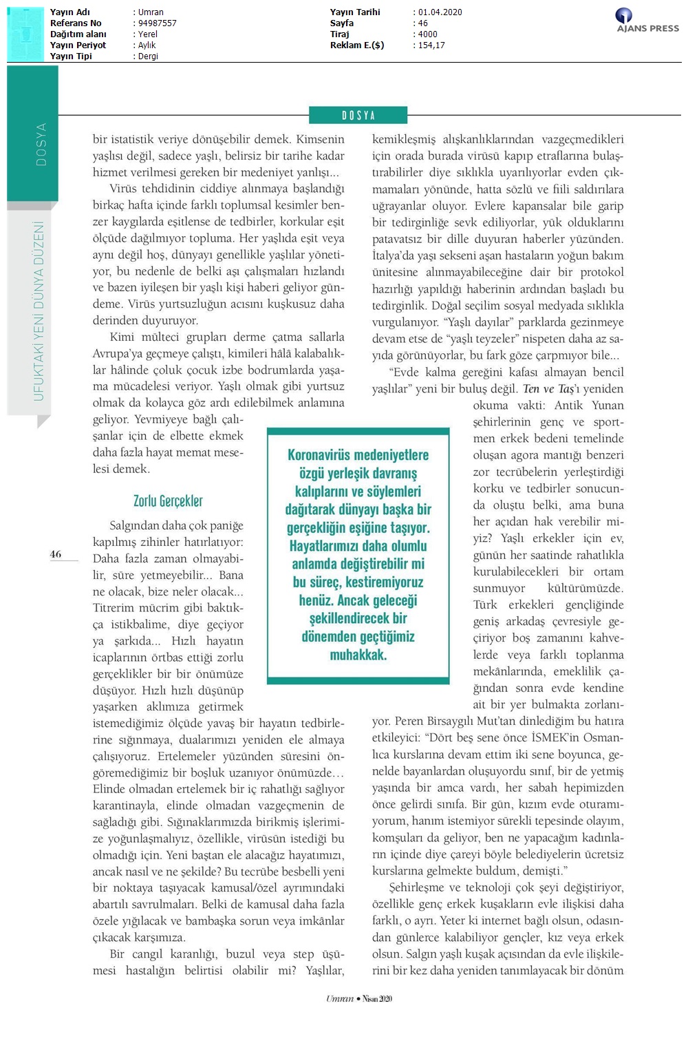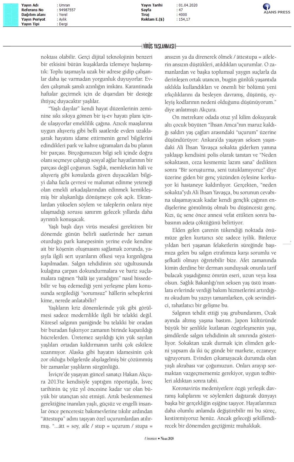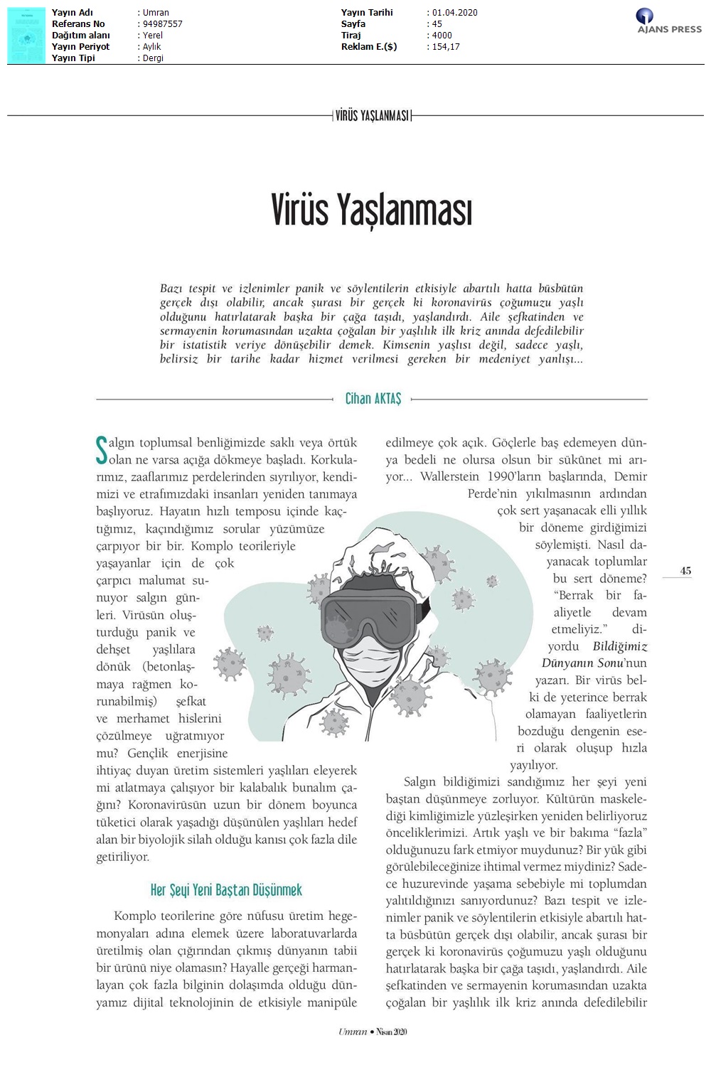 Basında YaşlılıkVirüs Yaşlanması Şubat 12, 2021 tarafından gönderildi alıntıdır 12 Nis Virüs Yaşlanması Not: Bu Yazı Umran Dergisinde 01.04.2020 tarihinde 45. sayfasında yayınlanmaktadır.