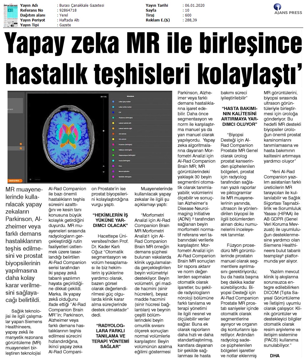 Basında YaşlılıkYapay Zeka MR ile Birleşince Hastalık Teşhisleri Kolayaştı Şubat 12, 2021 tarafından gönderildi alıntıdır 08 Oca Yapay Zeka MR ile Birleşince Hastalık Teşhisleri Kolayaştı Not: Bu Yazı Çanakkale Gazetesinde 06.01.2020 tarihinde 10. sayfasında yayınlanmaktadır.