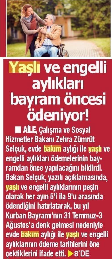 Yaşlı ve Engelli Aylıkları Bayram Öncesinde Ödeniyor