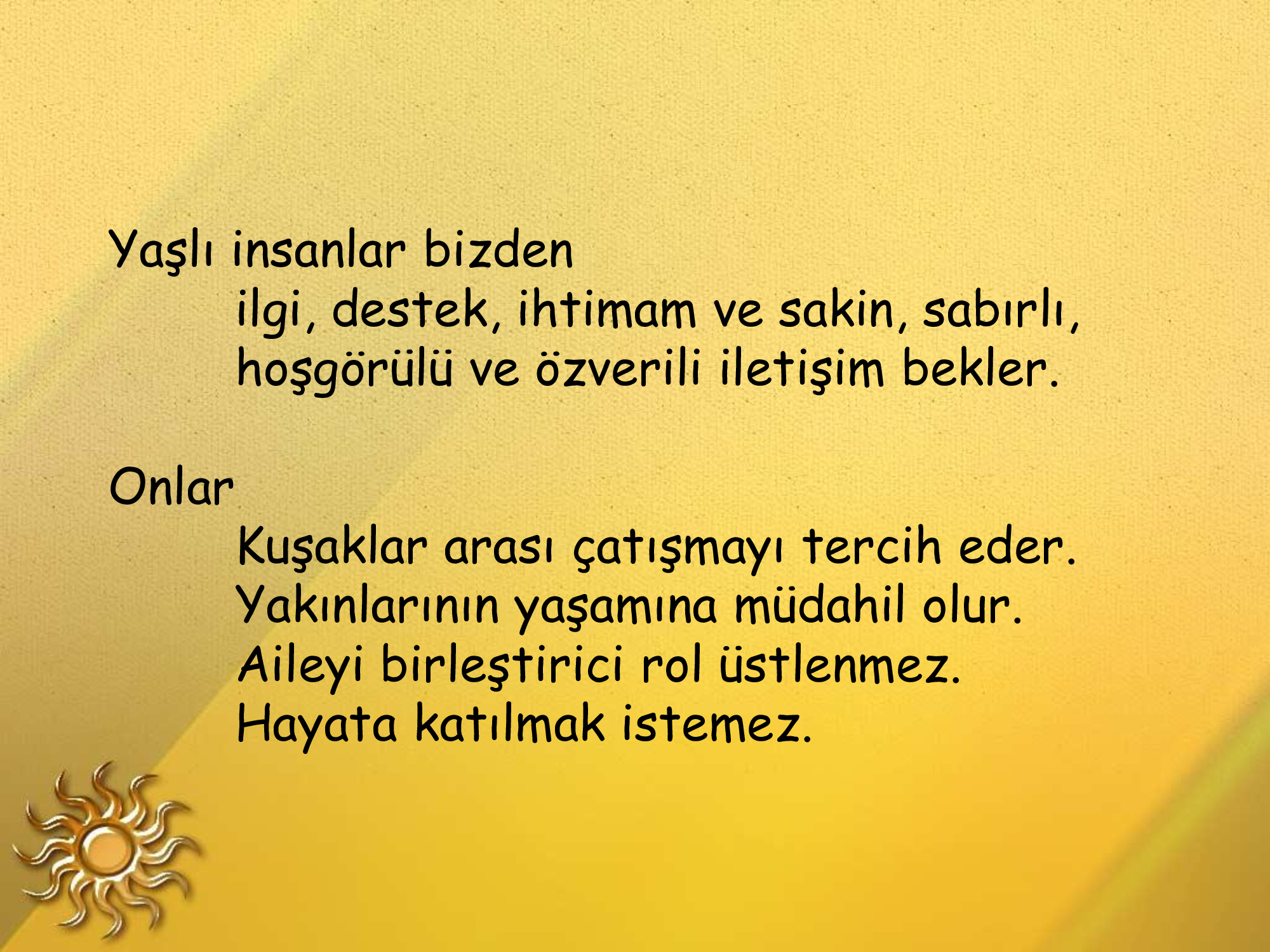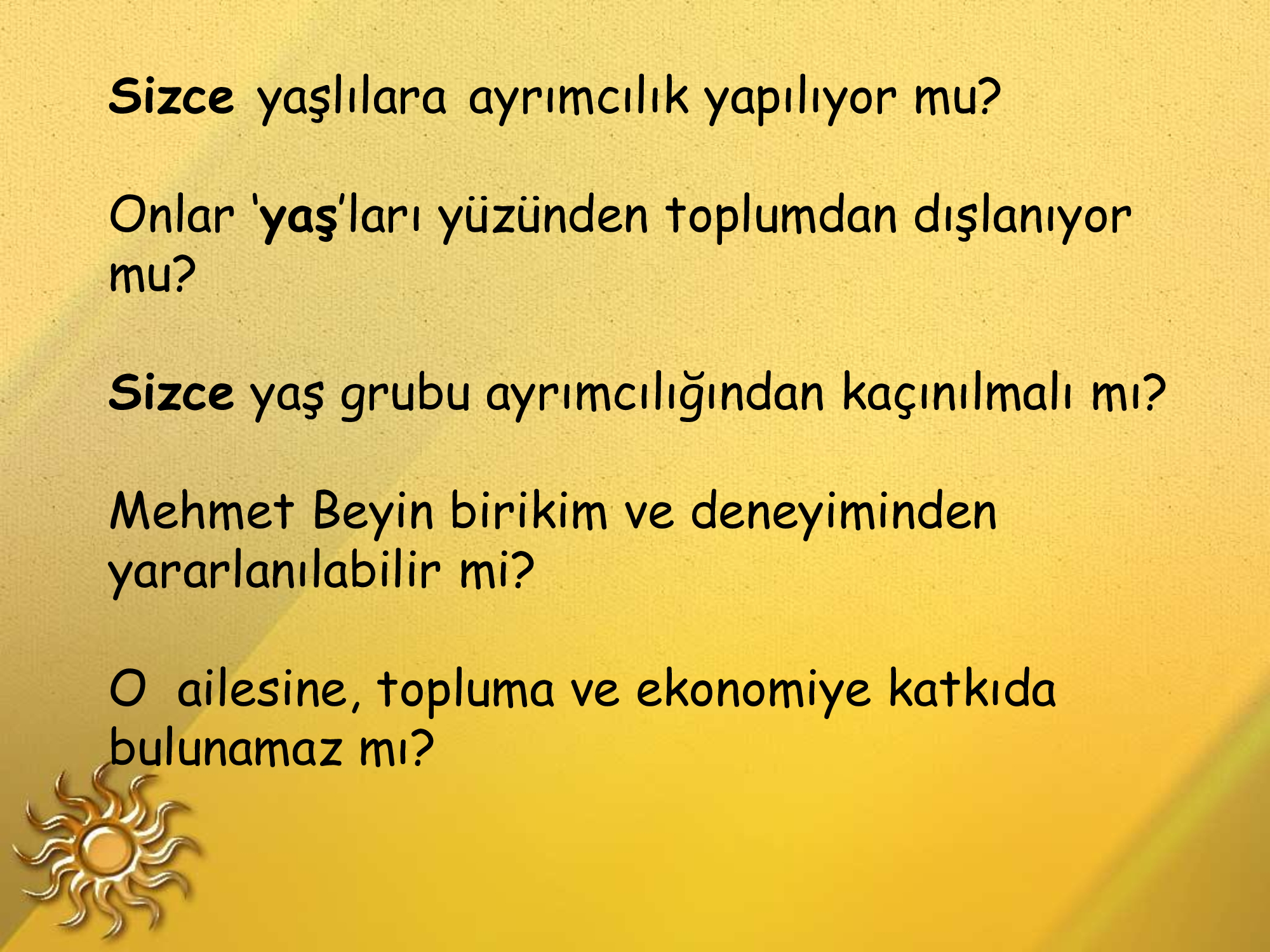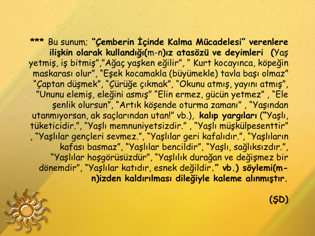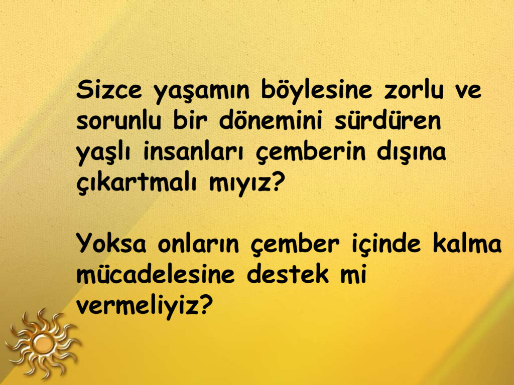 Yaşlılıkta da üretkenlik mümkündür yeter ki öğrenmeye açık olalım.Ben 76 yaşındayım ama hâlâ ortaokul lise öğrencilerine kendi branşında ve başka konularda yardımcı olabiliyorum.Bunun için de sürekli okuyorum.Önce kendimizi bırakmayacağız.Zamanın gerisinde kalmayacağız.