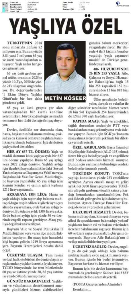 Basında YaşlılıkYaşlıya Özel Şubat 12, 2021 tarafından gönderildi alıntıdır 10 Şub Yaşlıya Özel Not: Bu Yazı Düzce Postası Gazetesinde 07.02.2020 tarihinde 2. sayfasında yayınlanmaktadır.